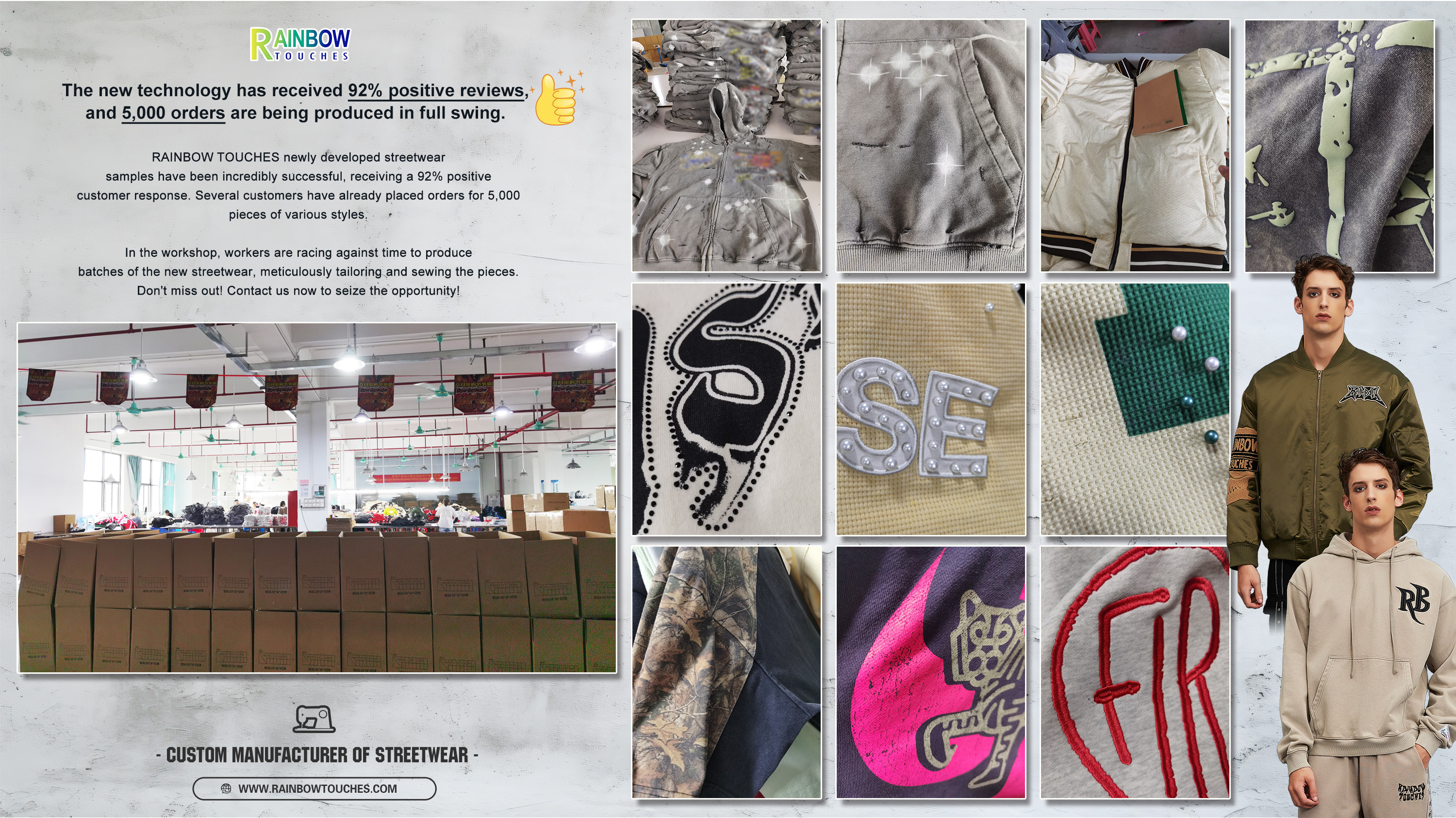 RAINBOW TOUCHES has truly outdone itself with its newly developed streetwear samples. These pieces, born from an innovative and revolutionary manufacturing process, have swiftly captured the hearts and eyes of the fashion - conscious crowd. The samples boast a unique blend of cutting - edge design elements, superior fabric quality, and an unparalleled level of comfort. It comes as no surprise that they've received an overwhelming 92% positive customer response. This high approval rating is a clear indication of the brand's ability to meet and exceed consumer expectations. As a result, several forward - thinking clients have recognized the immense potential of these streetwear items and have promptly placed orders totaling 5,000 pieces, covering a wide range of trendy styles to cater to different market segments.