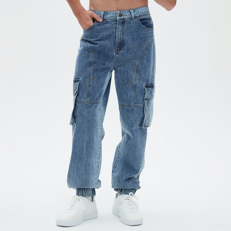 Original Design Vintage Washed Denim Workwear Pants | Washed & Embroidery | Denim Fabric Cargo Jeans