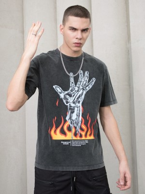 Custom Tshirts 220 Grams Acid Washed Fire Printing Mens Black Cotton Tshirts