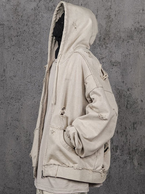 Scrap-inspired hoodie with a washed and torn design, paired with cotton fabric. Can be customized with brand logo.