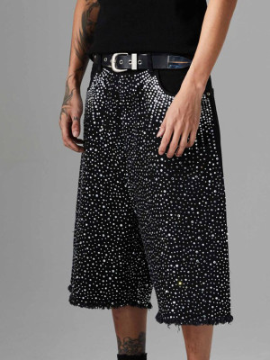 Streetwise distressed denim shorts. 100% cotton, relaxed fit, bold rhinestones, frayed edges. Edgy vintage vibe.