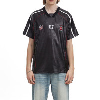 Retro sport jersey t-shirt with PU leather, mesh and embroidered accents for a retro-modern street style.