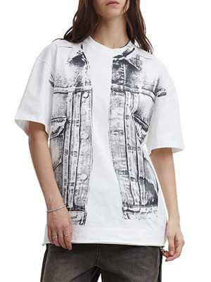 Graffiti fake two-piece T-shirt. Loose, made of 260 GSM pure cotton. Denim vest print creates a layered, fun street look.