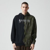 Extremely unique double fabric splicing hoodie with unique font embroidery print.