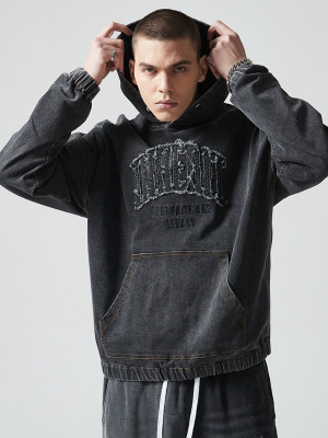 Custom Oversized Fit Vintage Denim Hoodie | Letter Printing | Blend Stretch Denim Fabric | OEM & ODM