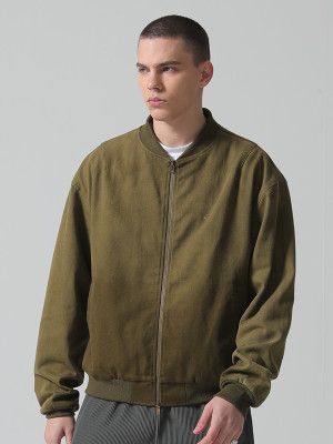 Washed cotton denim baseball jacket with relaxed fit and spray-dye finish for a clean, vintage streetwear look.