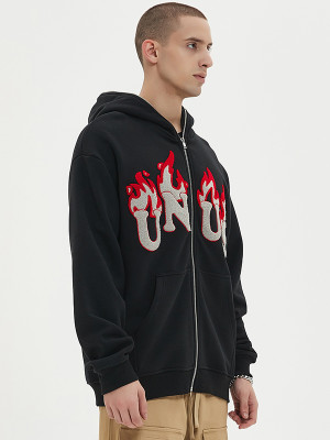 Oversized zip hoodie with flame towel embroidery, 360g cotton-blend fabric, perfect for bold custom streetwear collections.