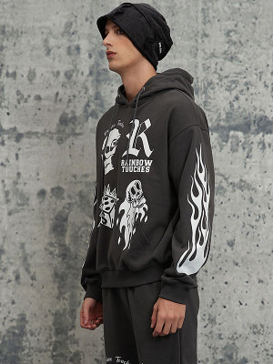 Custom Oversized Fit Punk Style Hoodie | Skeleton & Letter & Flame Pattern | Fleece Blend Fabric
