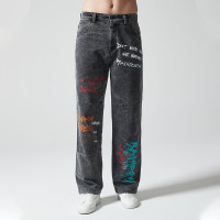 Oversized graffiti-print jeans with 100% cotton washed denim—perfect for streetwear brands seeking bold, customizable styles.