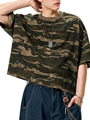 Boxy camouflage T-shirt with 270g 100% cotton fabric—perfect for American streetwear styles seeking bold, military-inspired looks.