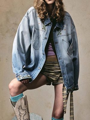 Oversized denim jacket with vintage wash and floral embroidery, crafted from a cotton-viscose blend.