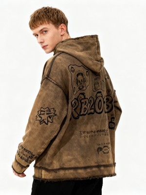 Original Design Brown Water Washed Vintage Hoodies | Direct Spray Print | Frayed Edge | Support OEM