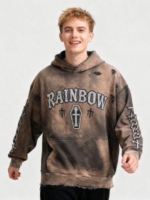 Washed Cotton Hoodies with vintage vibe, Rhinestone embellishments on the front and sleeves, Distressed Destroyed details, relaxed and edgy.