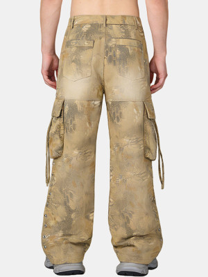 These cargo pants feature toweling embroidery, applique, digital print, spray - color, distressed holes, and rivets, offering a bold and unique street - style look.