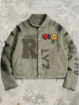 Elevate streetwear with this distressed workwear jacket, combining rugged charm & art via patch, towel embroidery, and prints.