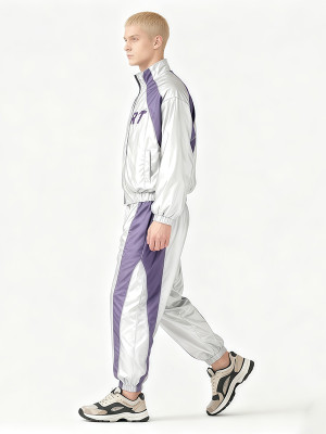 Make a bold statement with this metallic sweatpants set featuring vibrant color blocks and striking screen print details. Perfect blend of comfort and futuristic style.