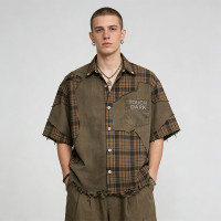 Patchwork frayed rubber print vintage short sleeve shirt, perfect for retro street style and custom bulk orders.