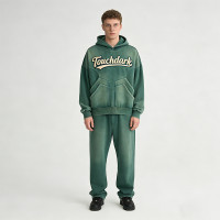 Washed spray dye applique vintage hoodie set, perfect for retro street style and custom bulk orders.